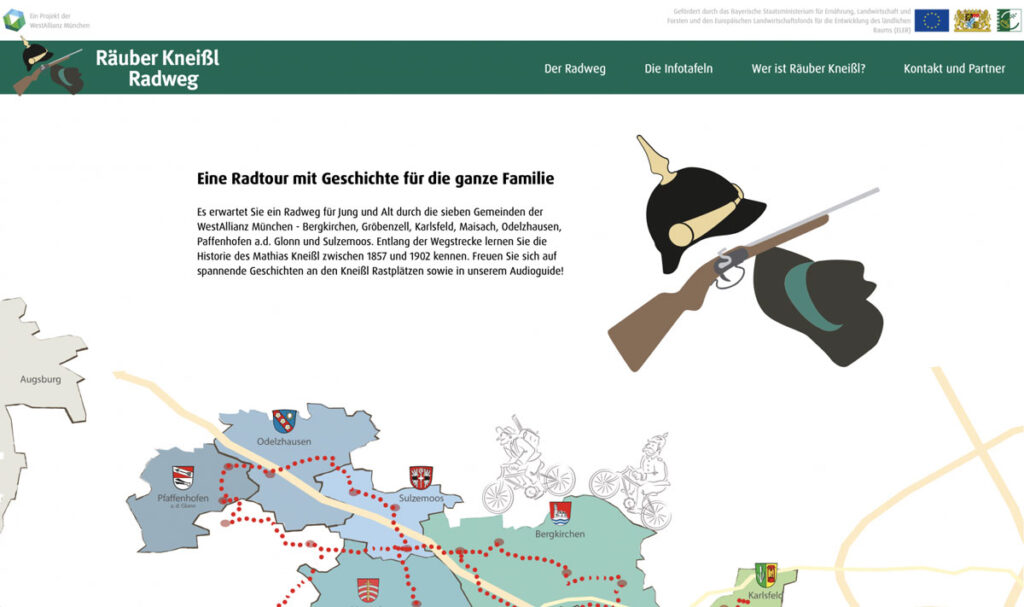 Die Themen-Strecke ist in vier Etappen unterteilt und führt über 110 Kilometer durch die Gemeinden Bergkirchen, Gröbenzell, Karlsfeld, Maisach, Sulzemoos, Odelzhausen und Pfaffenhofen a.d. Glonn, die im Wirtschaftsverbund WestAllianz zusammengeschlossen sind. Auf der Website www.räuber-kneissl-radweg.de gibt es viele Hintergrundinformationen zum neuen Radweg, zudem stehen die GPS-Daten der Etappen, die offizielle Radwanderkarte sowie ein Audio Guide zum Download bereit.
